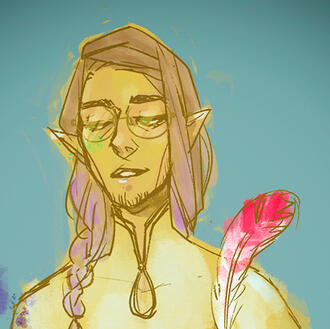 Put simply, I'm a middle-aged, bi, trans, ND creative who loves miniatures, gay romance in video games, and TTRPGs. My favorite thing to draw is people's OCs! (My 2nd and 3rd favorite things are elves and blood.)
